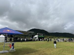 仮設のステージとモニタ、その前に広場があり、その反対側にはキッズエリア